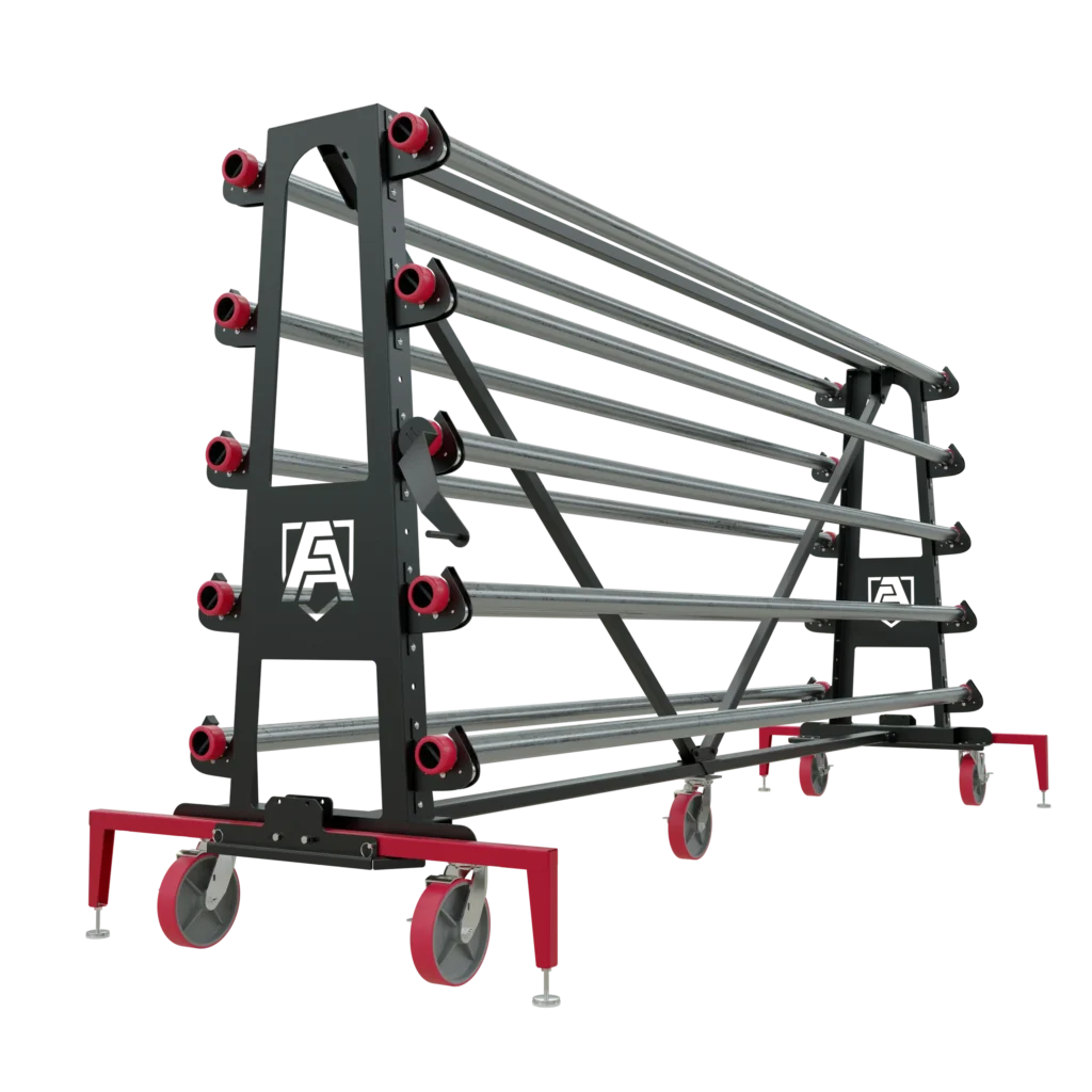 making sure to lock the casters and set the stabilizer arms. Begin deploying the vinyl cover by pulling it off the rack in at a steady pace. Once the first section is installed,