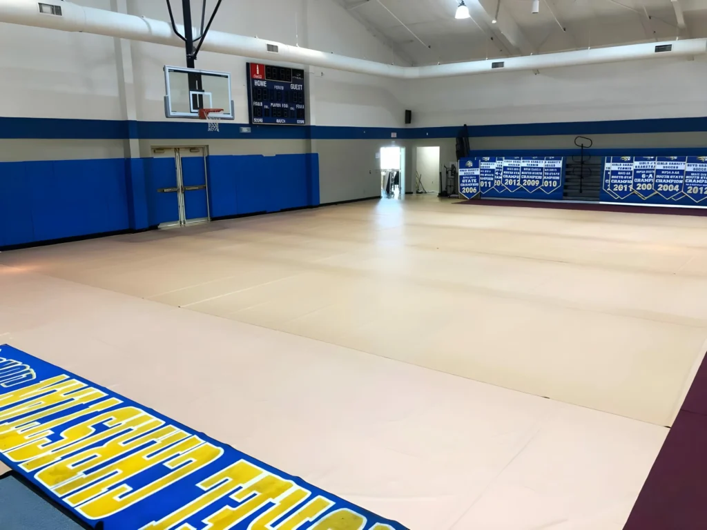 or moisture. This step prevents dirt from scratching the gym floor or becoming trapped beneath the cover. - Installation: Roll out the vinyl covers using specialized racks. For most gymnasiums,